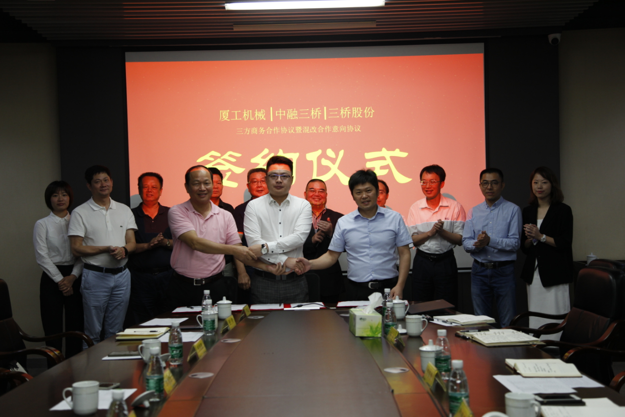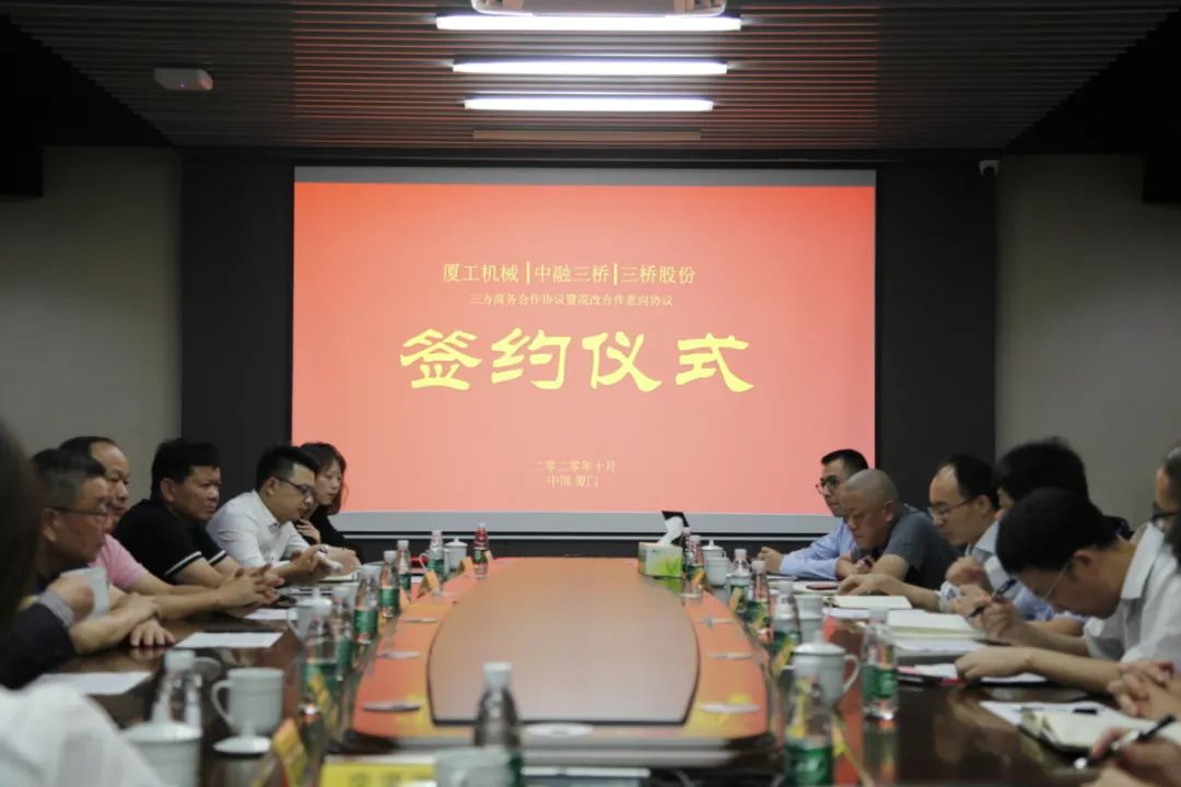 福建省機(jī)械工業(yè)聯(lián)合會(huì)會(huì)長(zhǎng)許振明;廈工股份公司總裁林春明、副總裁兼財(cái)務(wù)總監(jiān)李喜勇、總工程師黃鶴艇;中融三橋公司蔡報(bào)軍、董事長(zhǎng)姜洋、總經(jīng)理吳繼成出席簽約儀式。